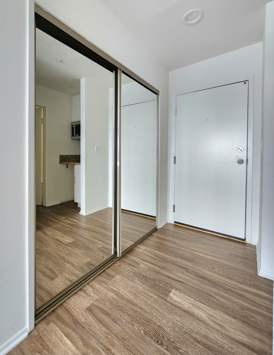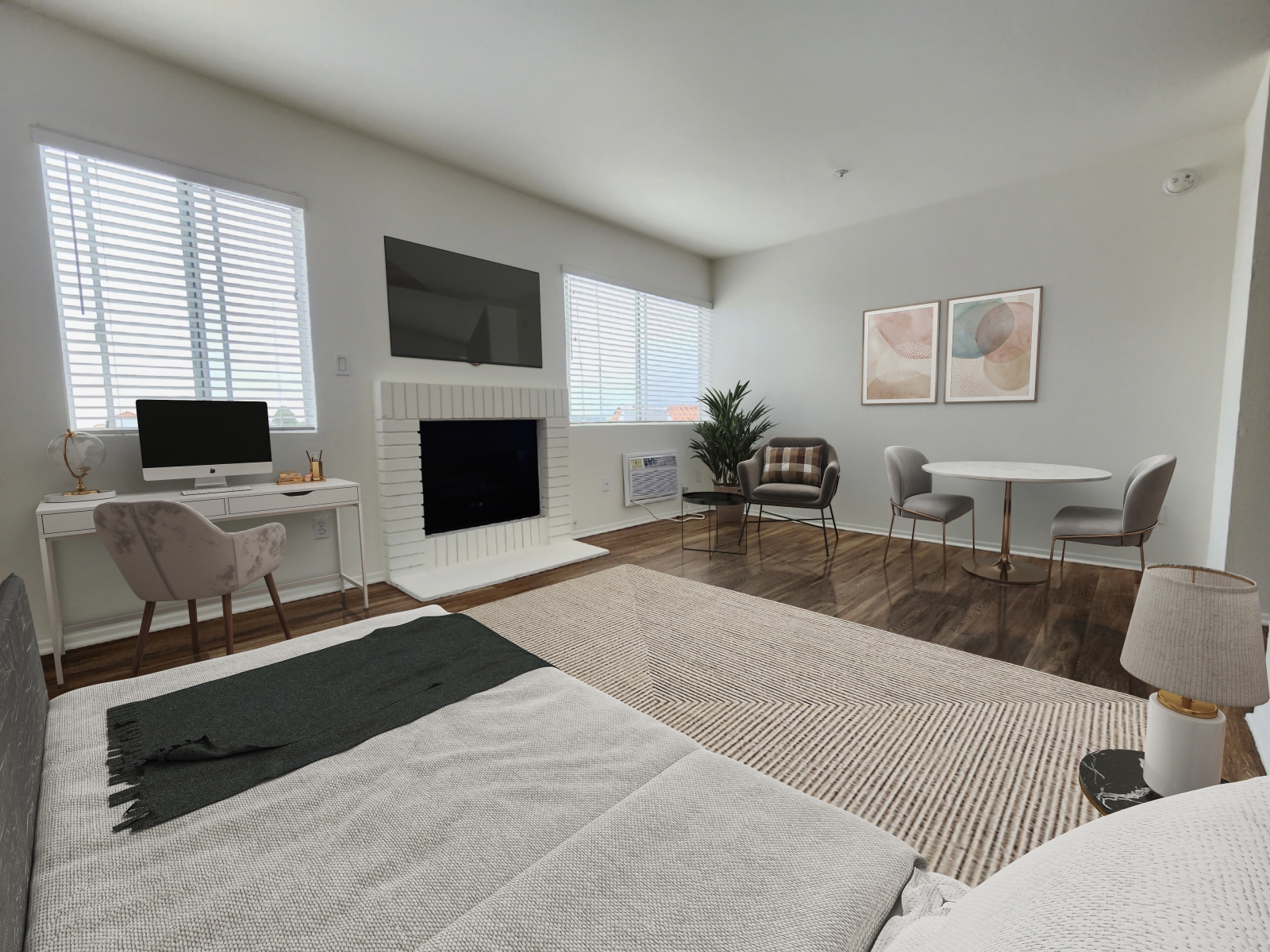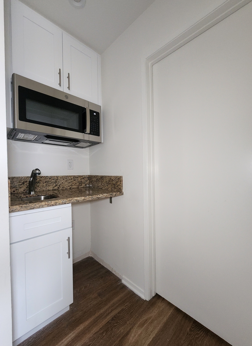 Beautiful new remodel! Top floor studio with laminate flooring throughout, air conditioning, mini refrigerator and microwave. Closet has mirrored doors and good light. Perfect Pied a Terre in the city. Contemporary elevator building with sundeck in great Brentwood location close to shops & restaurants. . Please note the unit is unfurnished.