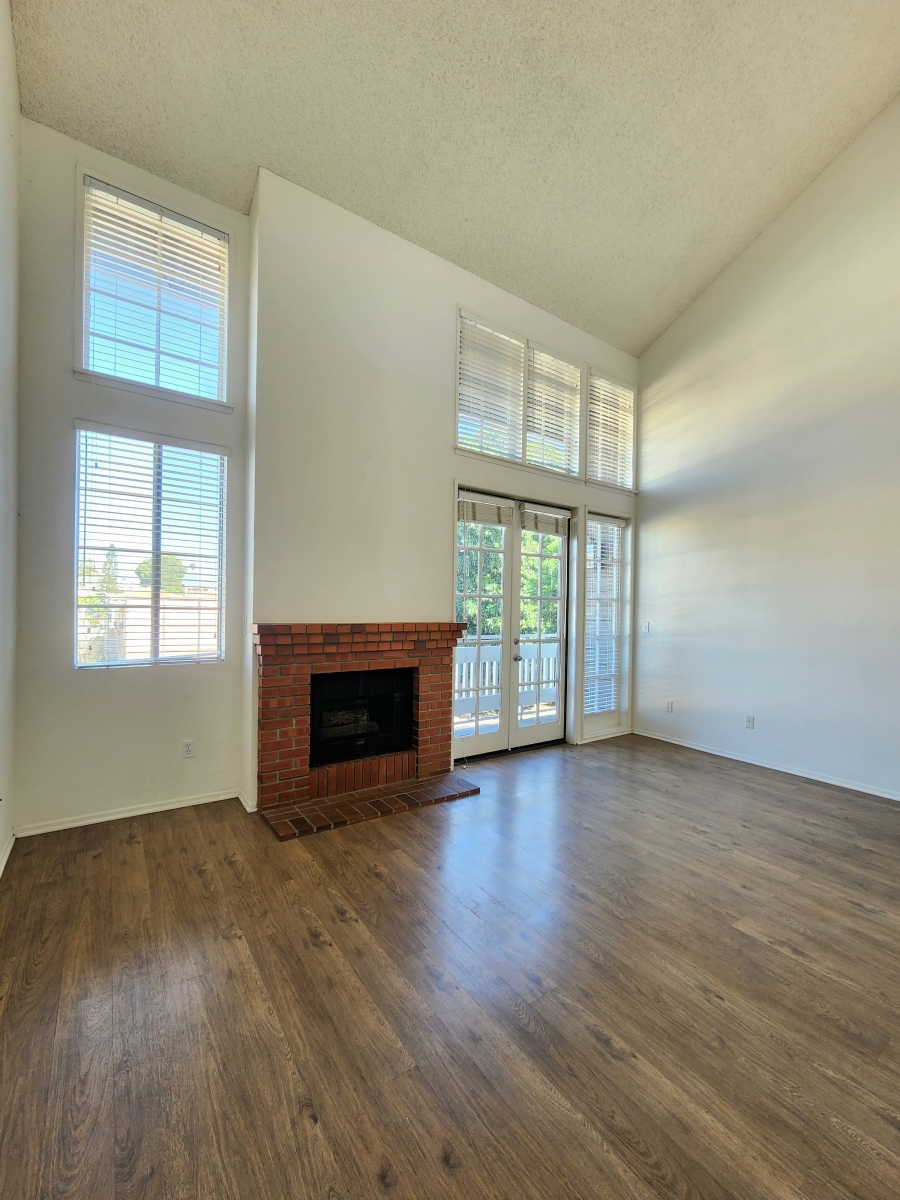 High ceilings, hardwood floors, fireplace, French doors to the balcony highlight the spacious living room