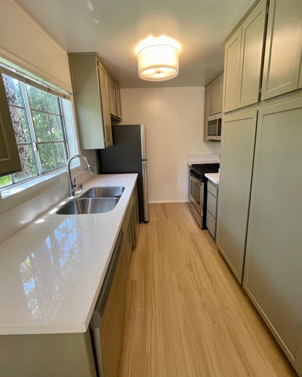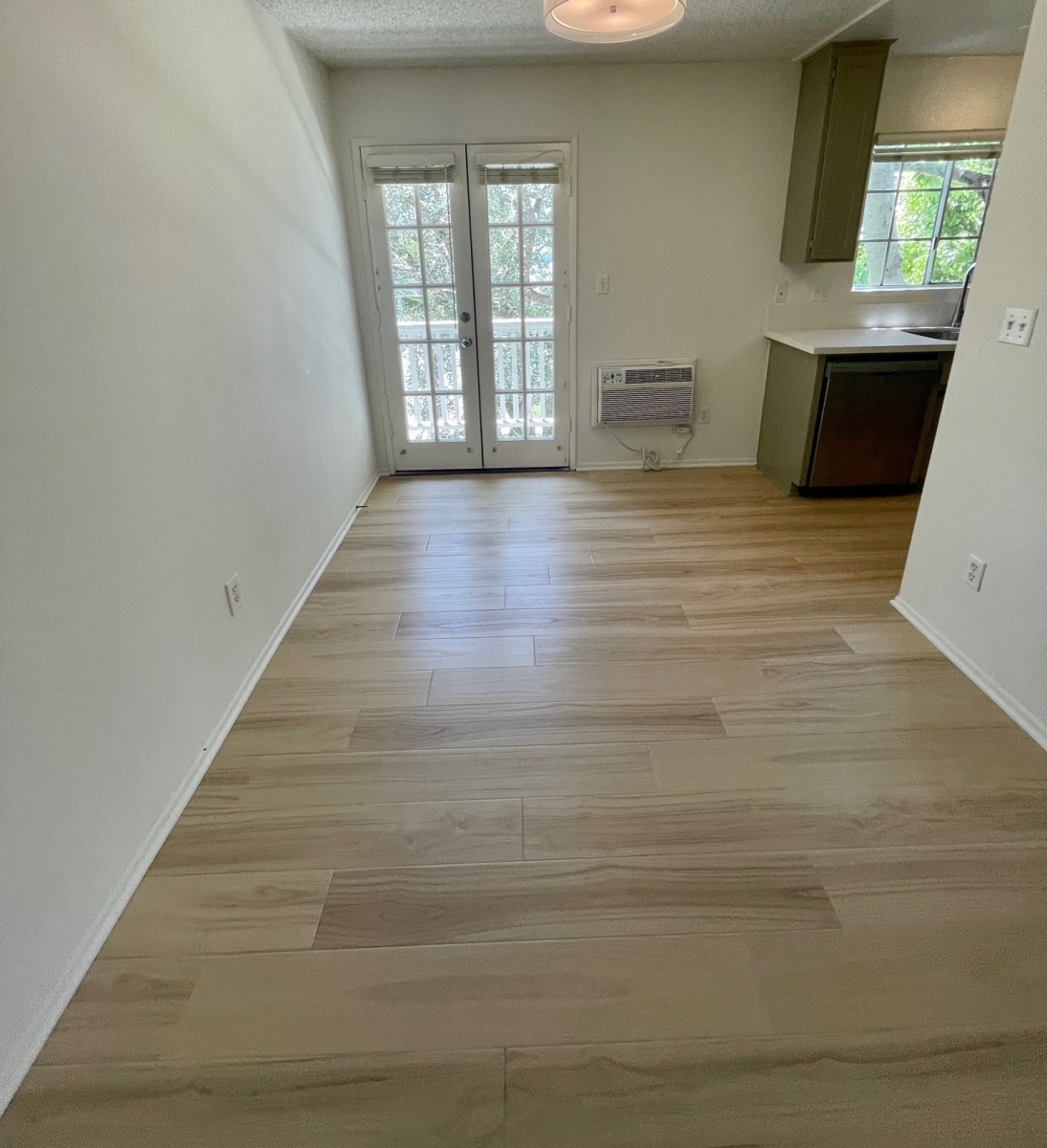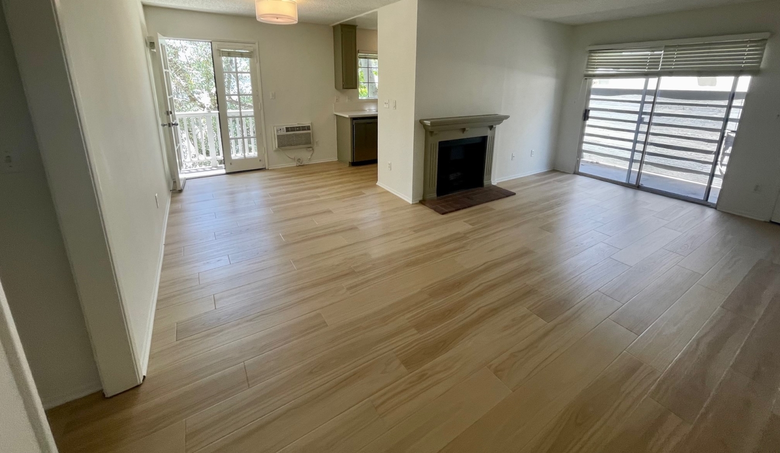 Immaculate lower front corner unit with brand new laminate flooring, french dooors, balcony, patio, gas fireplace, air conditioning unit, quartz counter tops, stainless steel appliances. 2 Story Cape Cod style building. Tandem parking. .