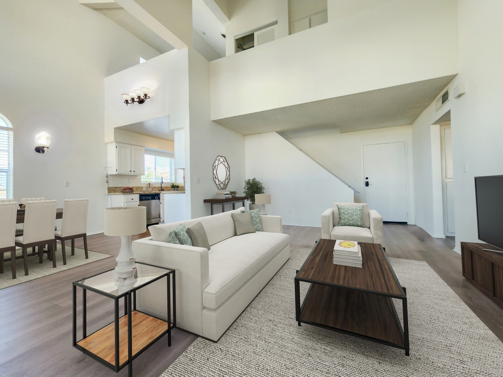 Gorgeous and bright, this updated top floor, front unit has 1 bedroom, a loft, and 2 bathrooms. New wood laminate floors throughout. Living room has a gas fireplace and 20 ft. cathedral ceilings with city views. Updated kitchen with walk-in pantry, granite countertops and stainless steel appliances. The loft has a large closet and full bathroom for a second bedroom or office. Two parking spaces in garage. Community laundry room.