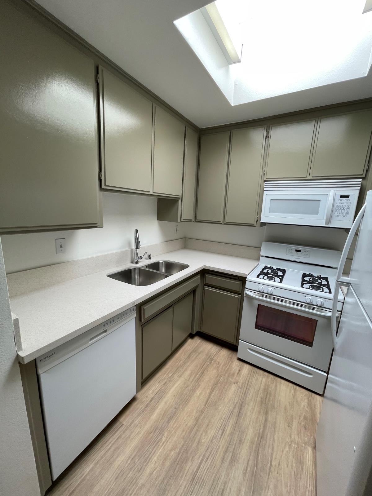 Top floor with high ceilings, skylights in the kitchen & both bathroom, air conditioning gas fireplace, laminates throughout , balcony . 2 story Cape Cod style building ..
