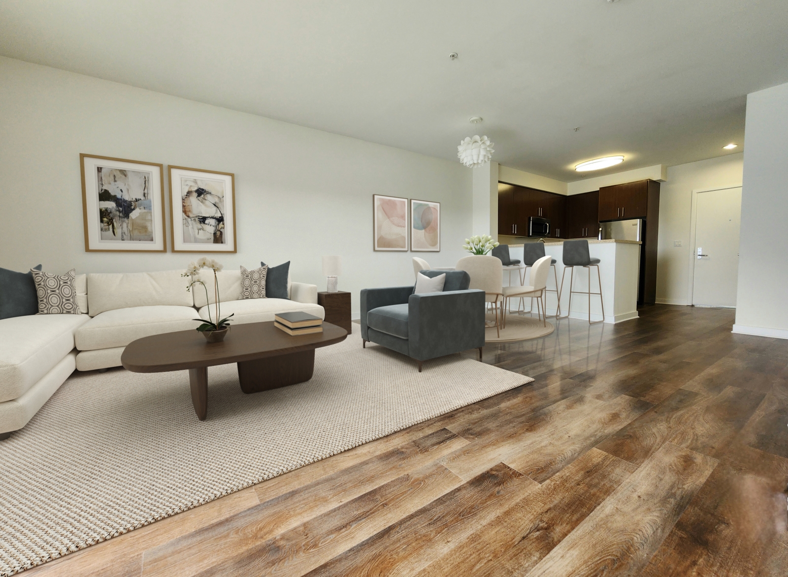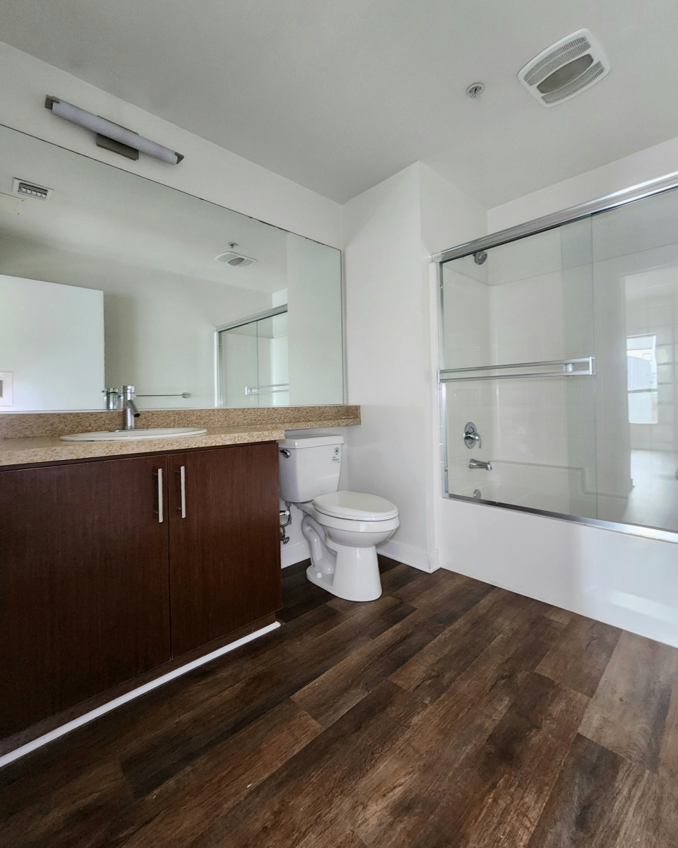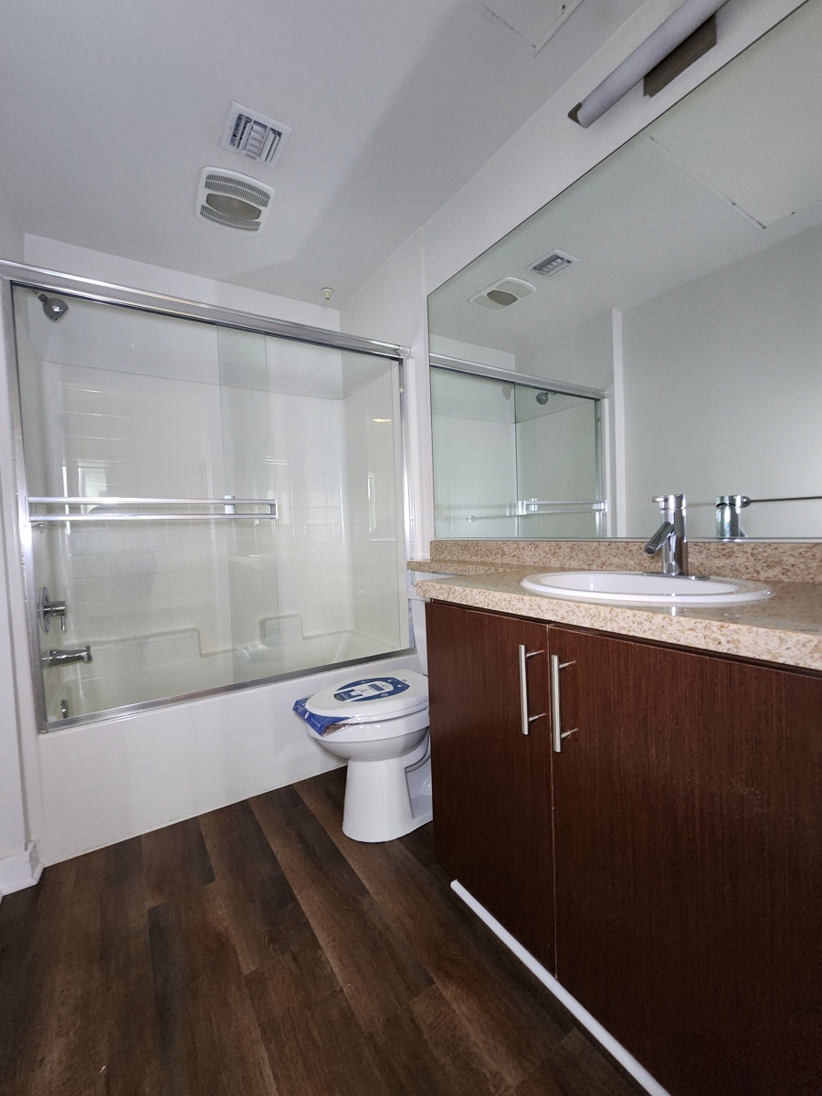 Spacious 2B+2B with laminates throughout, central air & heat, balcony, washer & dryer, quartz counter tops in kitchen & bathroom , stainless steel appliances.