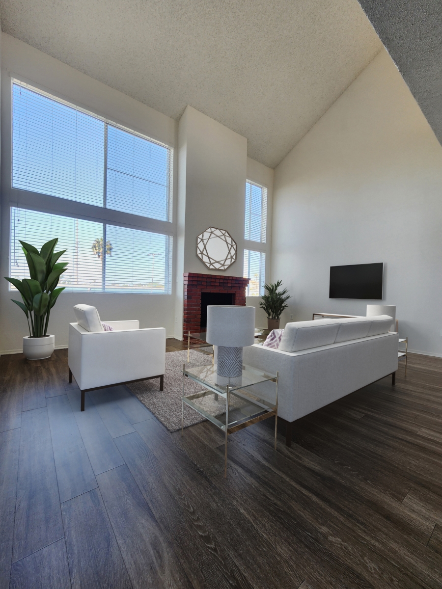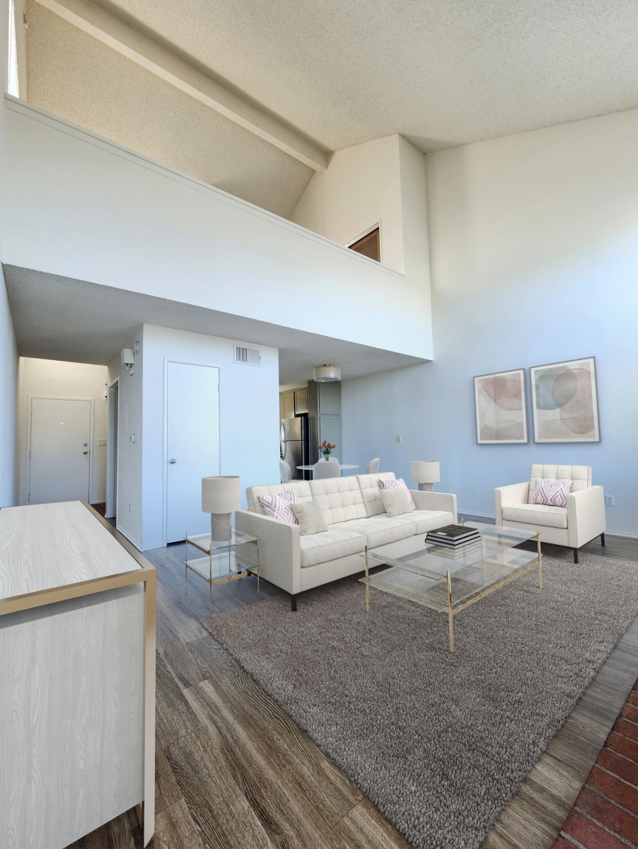 High ceilings, hardwood floors, spacious living room.