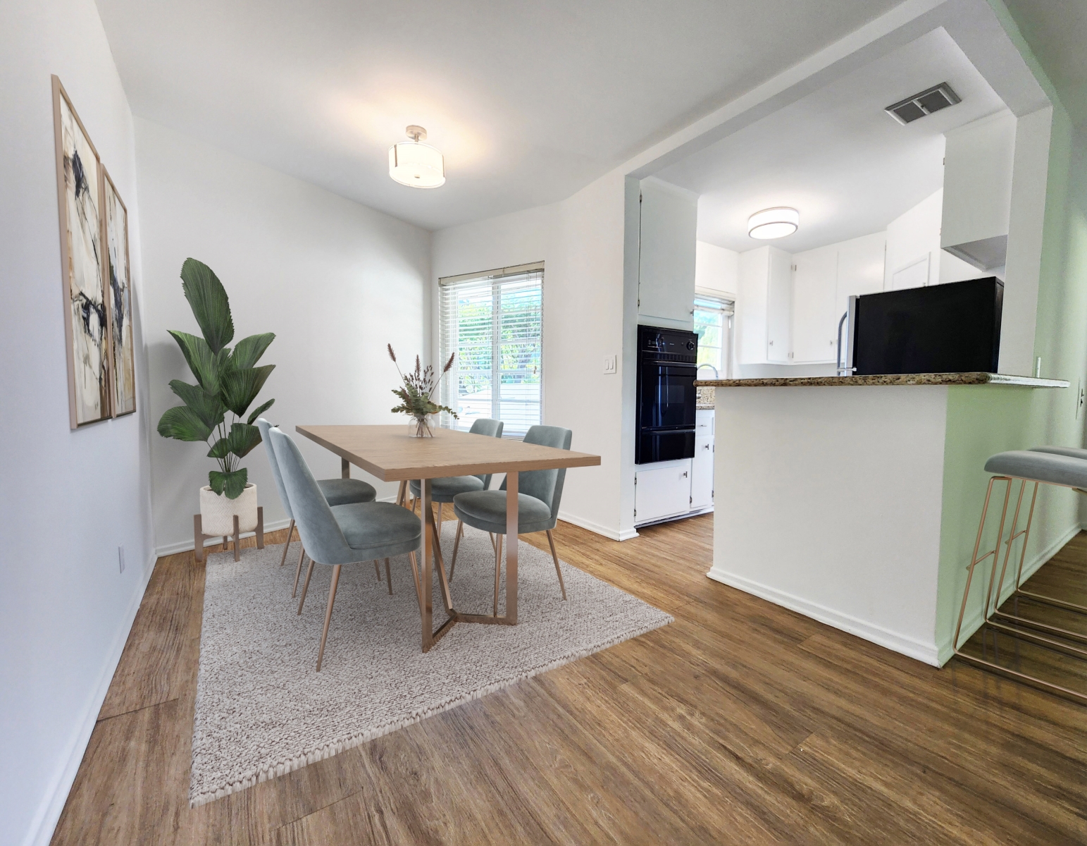 Cozy and cute upper unit has views of greenery and Getty Center! Wood laminate flooring throughout. Kitchen has stainless steel appliances, granite counters, extra storage in pantry closet. Bedroom has two closets with stylish barn doors. Bathroom has separate tub and shower, custom tile, granite counter vanity, large closet. Wall AC in living room. Enjoy the pool area surrounded by rustic landscaping. Community laundry room. One carport space for small car. Great area in Bel Air near local shops.