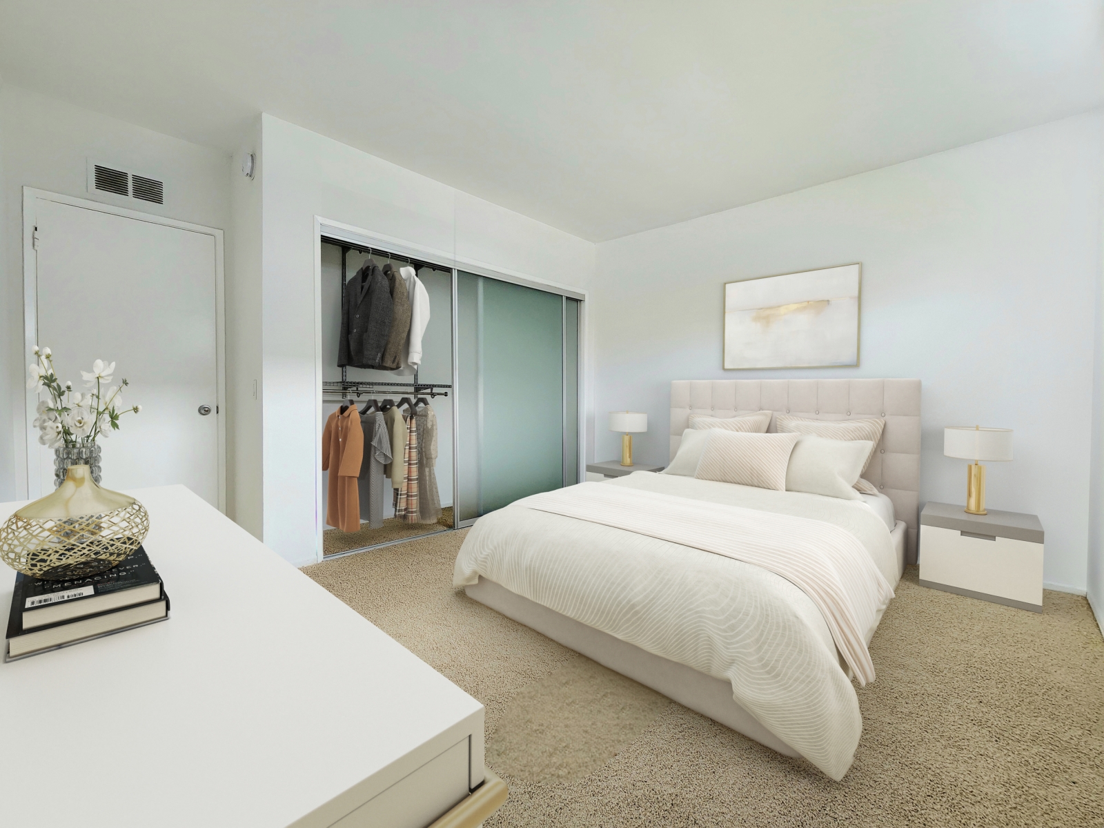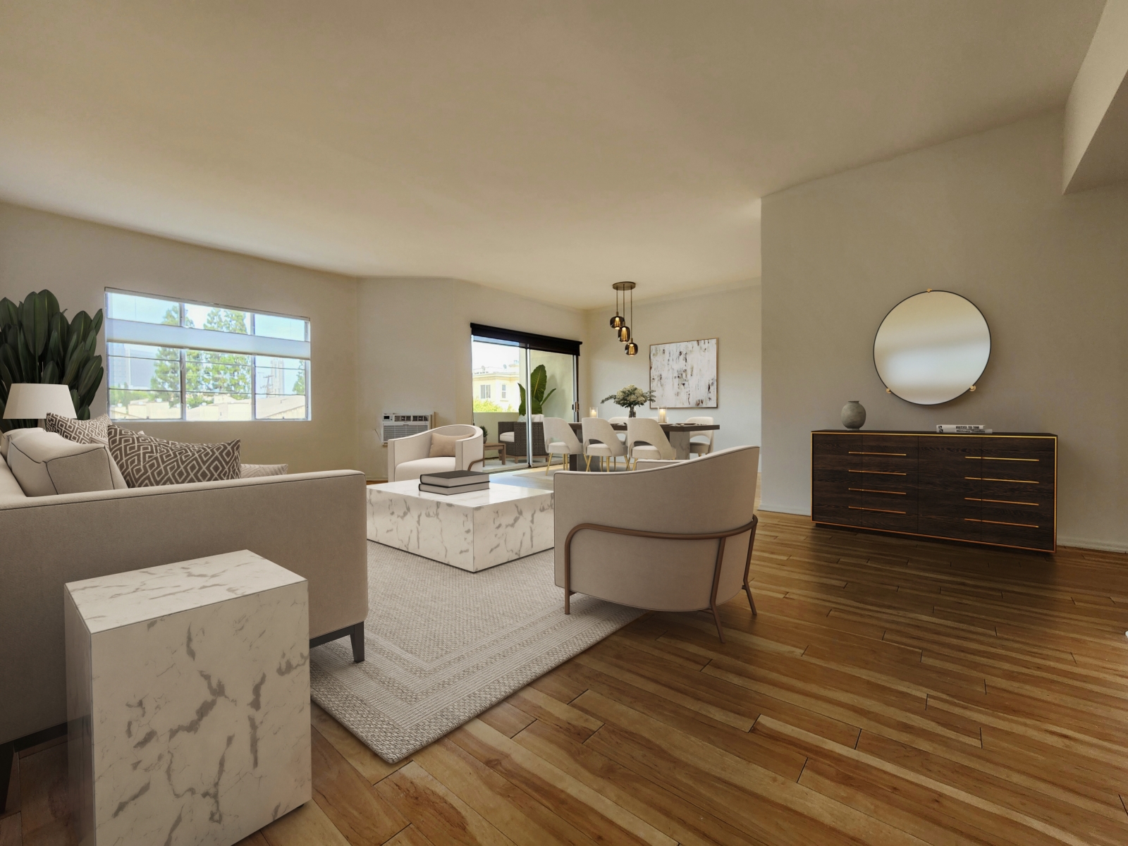 Front-facing, top floor unit in 3-story elevator building. Living room has wood laminate floors, wall AC and sunny balcony. In-unit washer/ dryer in entry closet! Carpet in bedrooms. Great Westwood area near Century City shopping. One parking space included. Please note the unit is unfurnished.