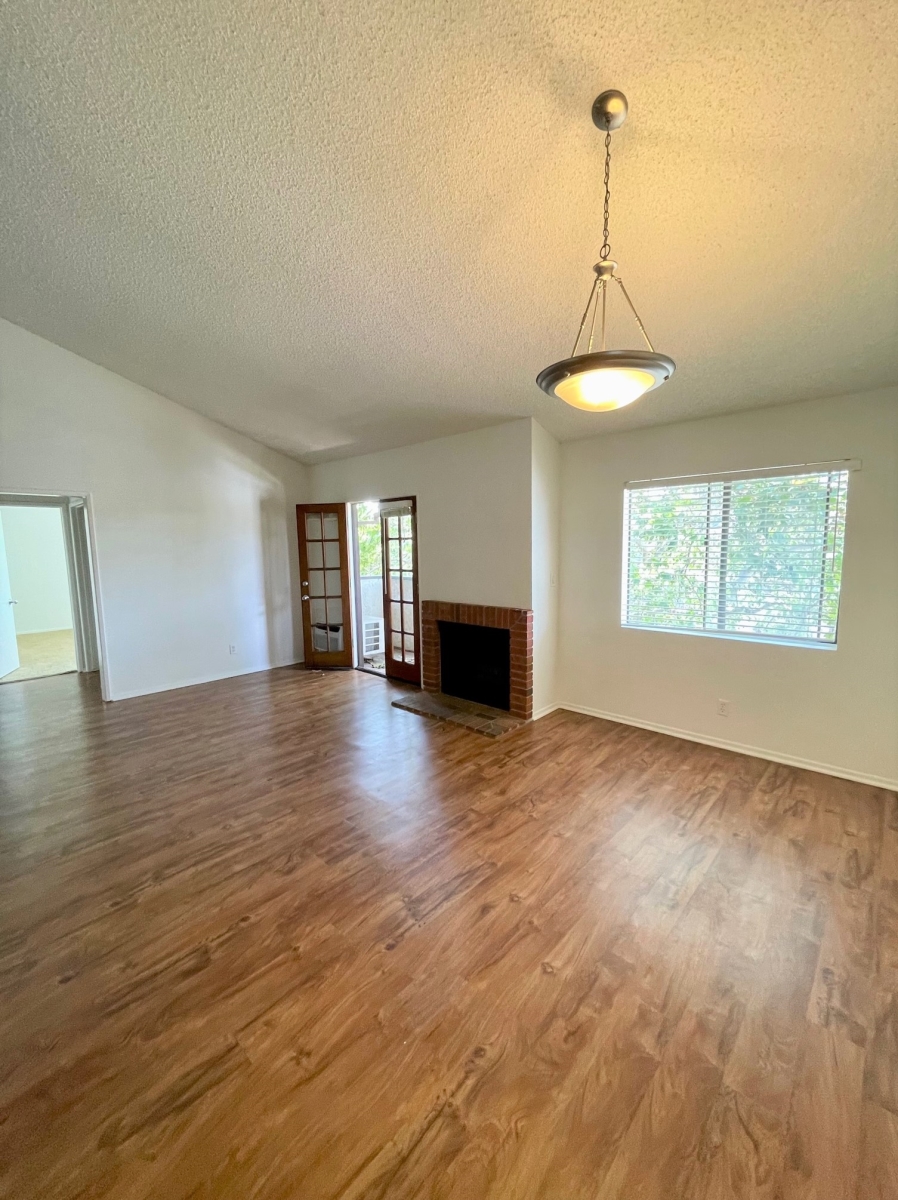 Top floor front corner unit with wood laminates, vaulted ceilings, French doors, balcony, gas fireplace, AC unit in living room. Gated building & parking.