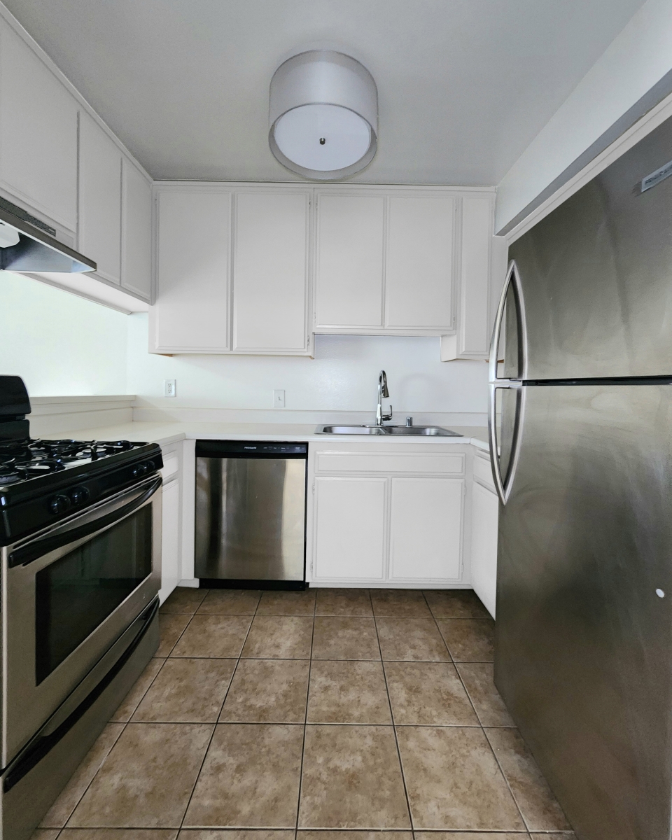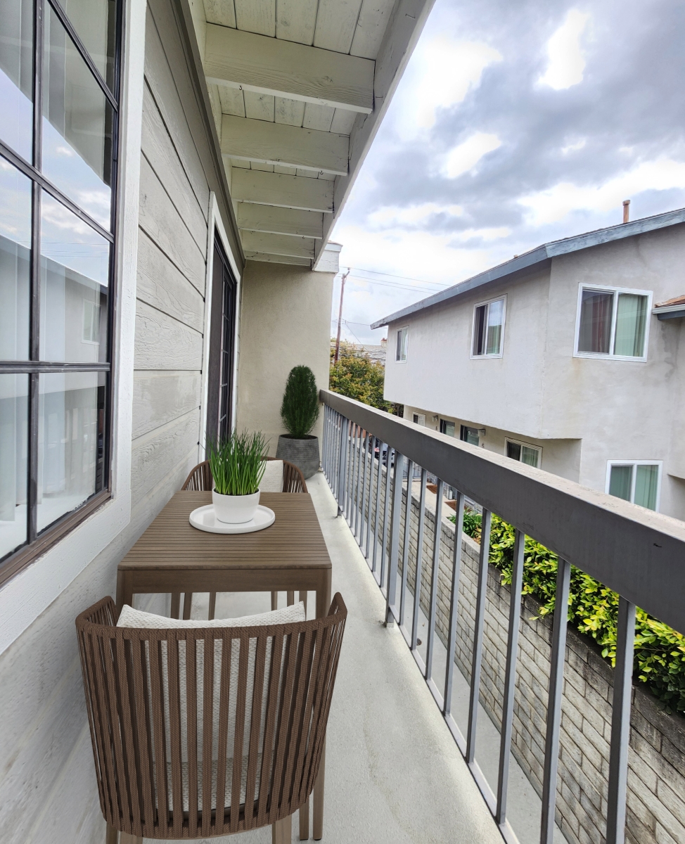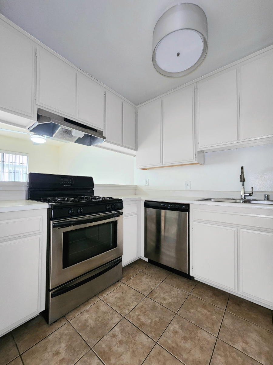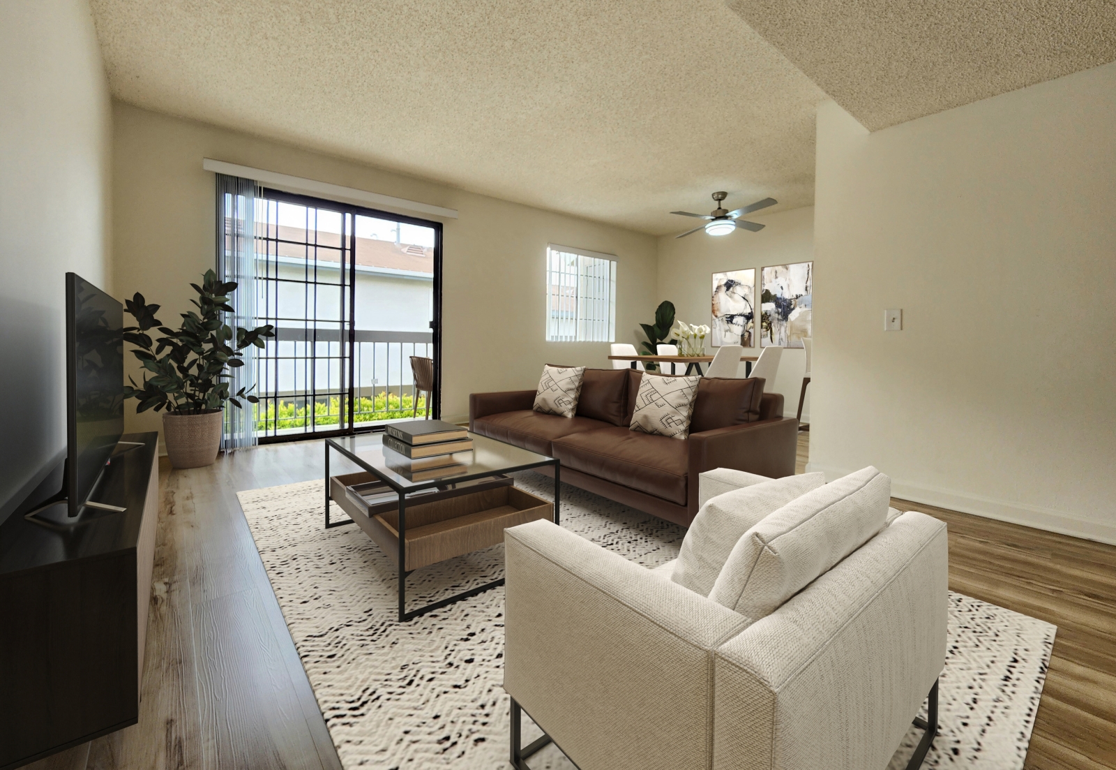 Spacious, bright, beautiful upper unit with new wood grain laminate flooring throughout. Ceiling fan. Wall AC unit in the living room and in master bedroom /central heating. Stainless steel appliances including dishwasher. Living room has a slider to sunny balcony. 2 parking spaces in a subterranean garage quiet residential neighborhood of Sunset Park with easy access to the 10 freeway. Please note: the unit is unfurnished