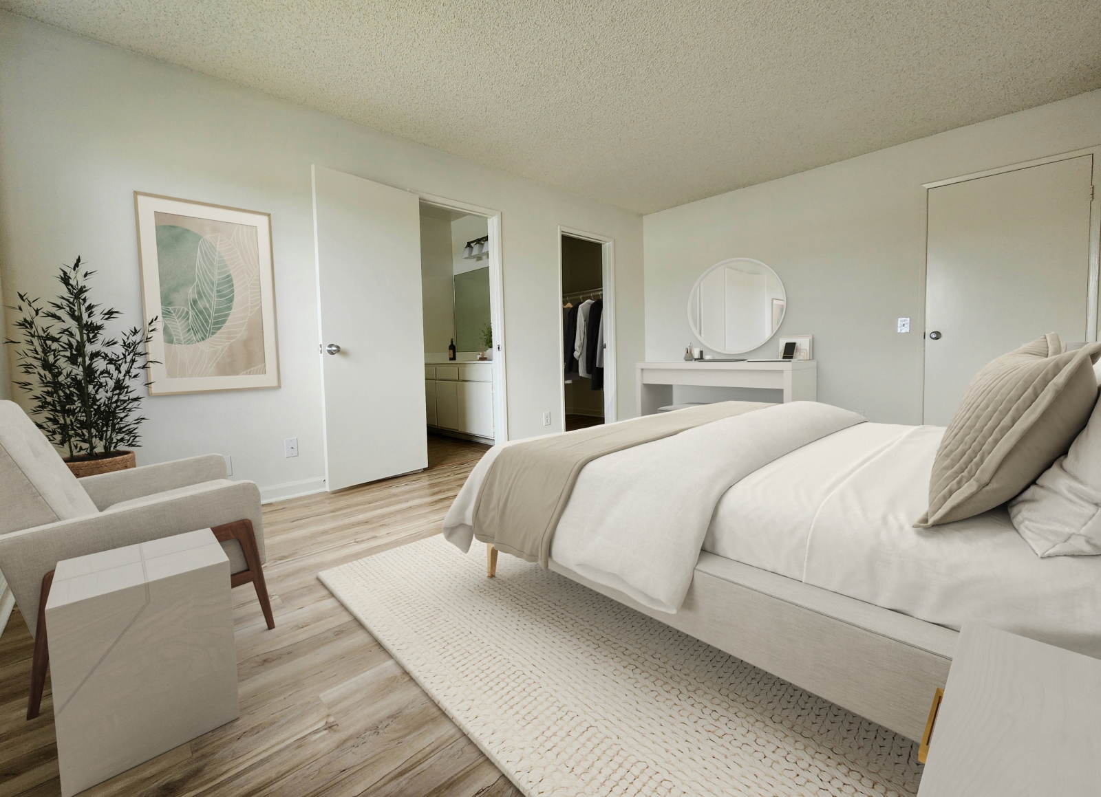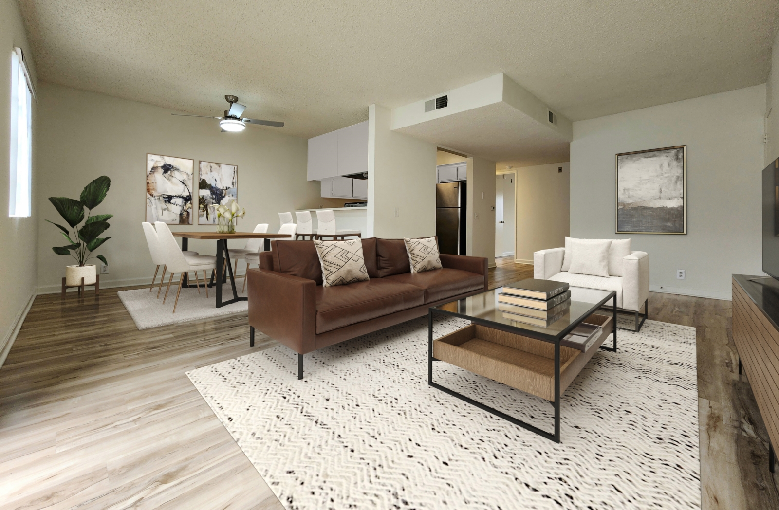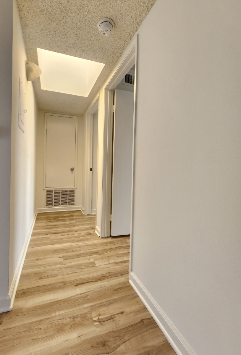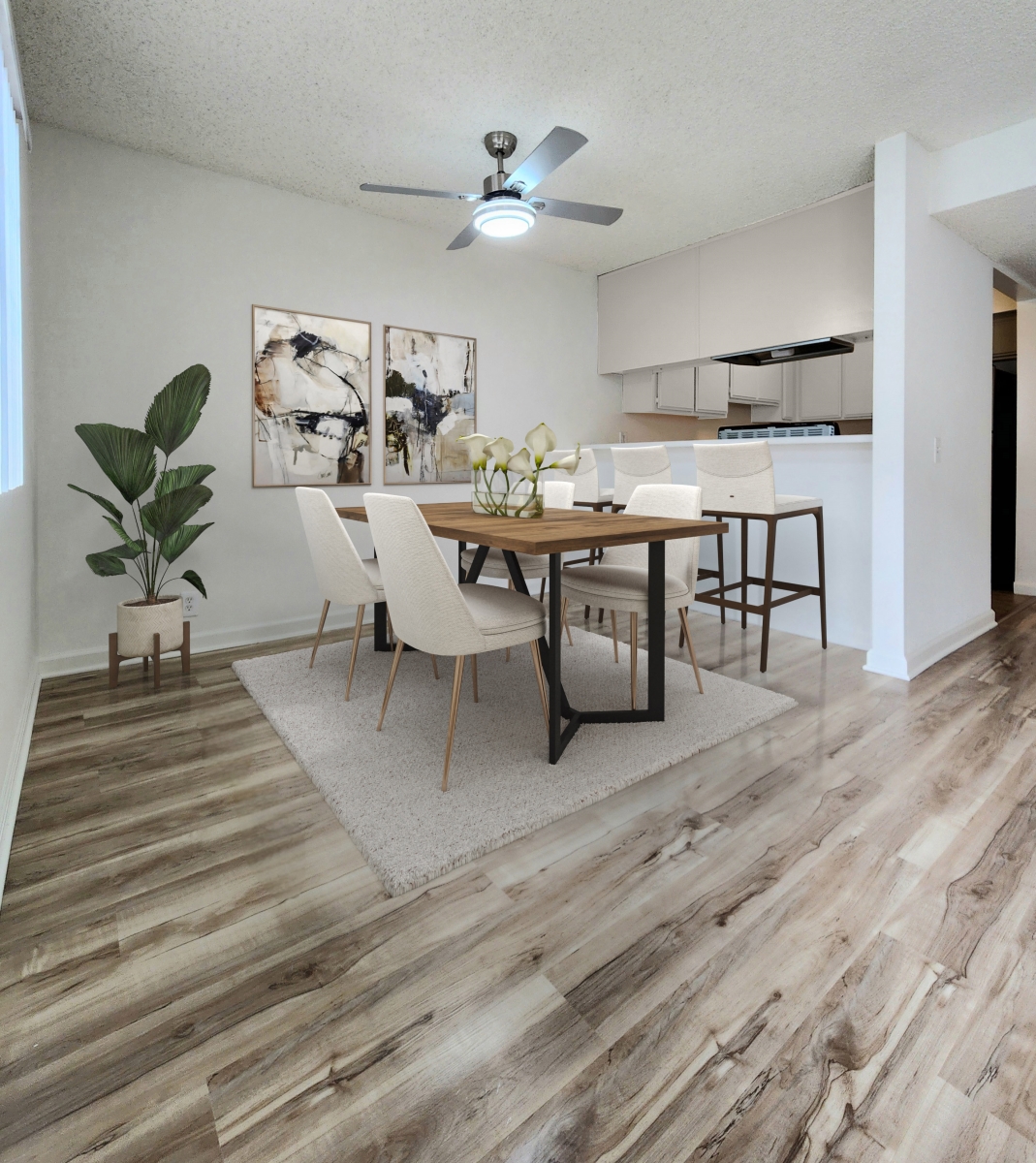 Spacious, bright, beautiful upper unit with new wood grain laminate flooring throughout. Ceiling fan. Wall AC unit in the living room and in master bedroom /central heating. Stainless steel appliances including dishwasher. Living room has a slider to sunny balcony. 2 parking spaces in a subterranean garage quiet residential neighborhood of Sunset Park with easy access to the 10 freeway. Please note: the unit is unfurnished