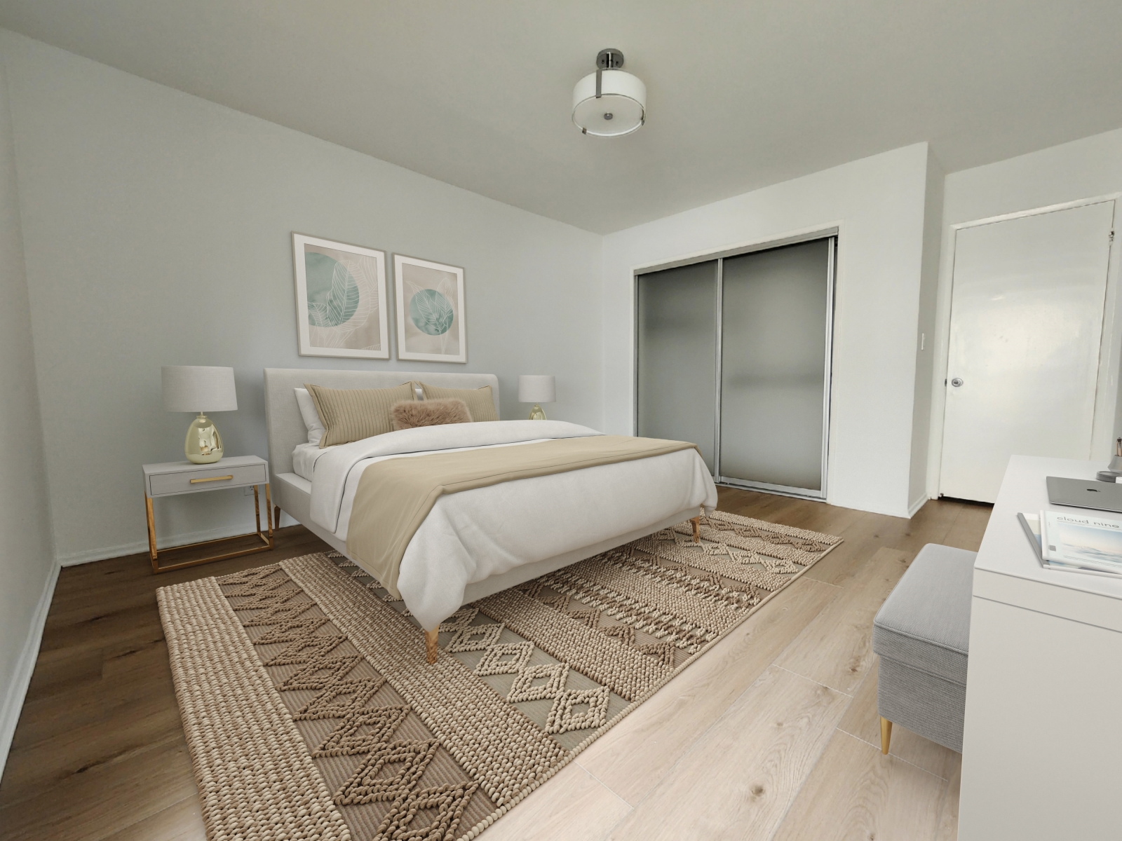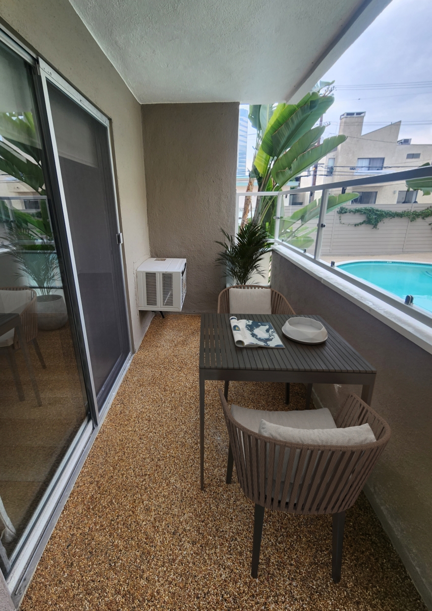 Large bright 2nd floor unit with balcony, laminate flooring and carpet in the bedroom. kitchen quartz counter tops, 3 story contemporary elevator building with swimming pool in great location just south of Brentwood.